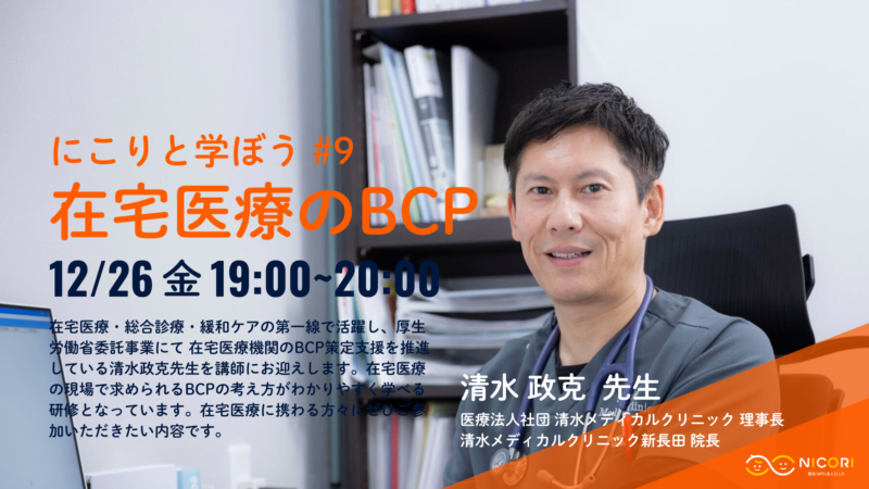 今回の「にこりと学ぼう」では、在宅医療・総合診療・緩和ケアの第一線で活躍し、厚生労働省委託事業にて在宅医療機関のBCP策定支援を推進している清水政克先生を講師にお迎えします。在宅医療の現場で求められるBCPの考え方がわかりやすく学べる研修となっています。在宅医療に携わる方々にぜひご参加いただきたい内容です。