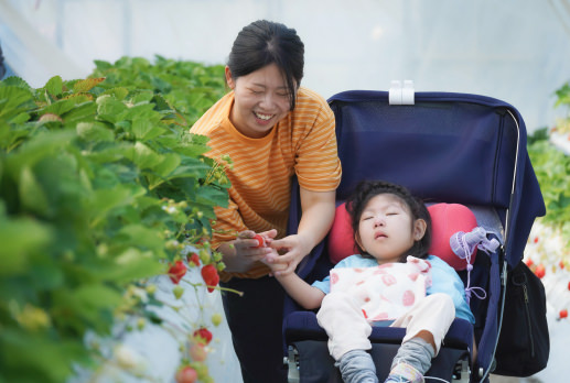 毎年恒例のいちご狩り!医療用バギーが通れるよう作ってくださっている広渡農園さんでは、毎年多くのこどもたちが生まれてはじめてのいちご狩りを体験しています。きょうだい児さんもパパママもみんな笑顔になった一日。